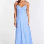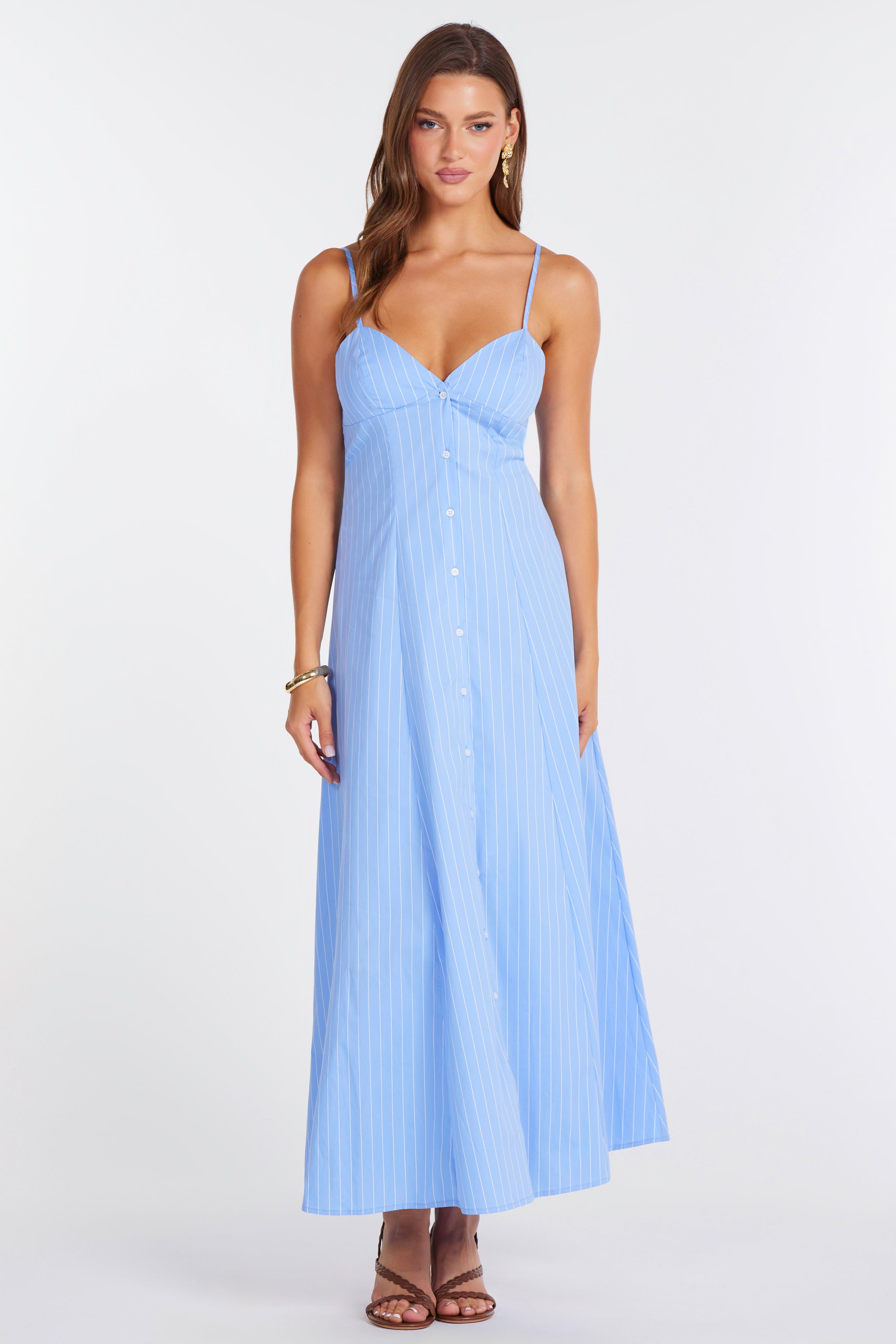 An effortlessly romantic silhouette, this pinstriped maxi dress features a flattering sweetheart neckline, delicate spaghetti straps, and a button-front detail for timeless appeal. Lightweight and flowy with a softly tailored fit, it moves beautifully from day to night. Style it with flat sandals and gold accents for sun-soaked days, or dress it up with heeled sandals and a sleek clutch for warm-weather evenings.