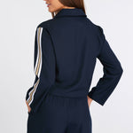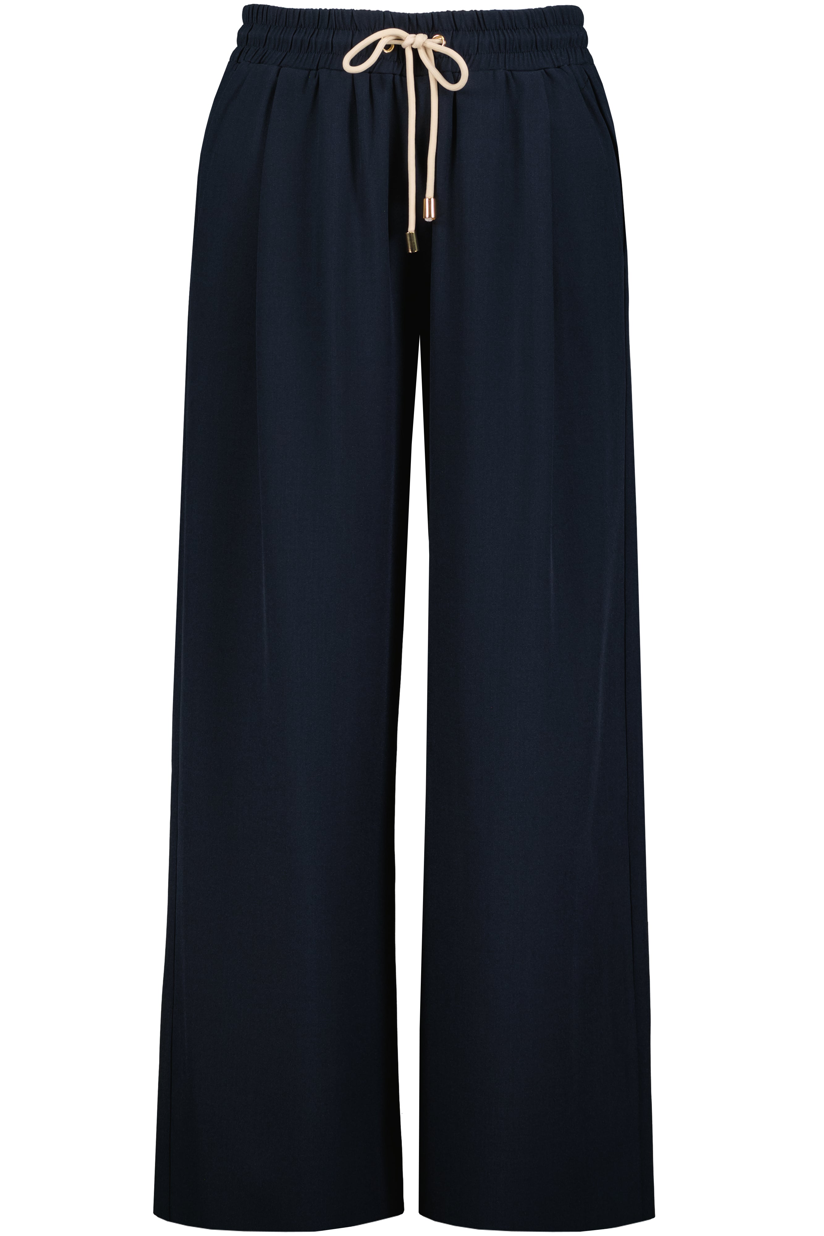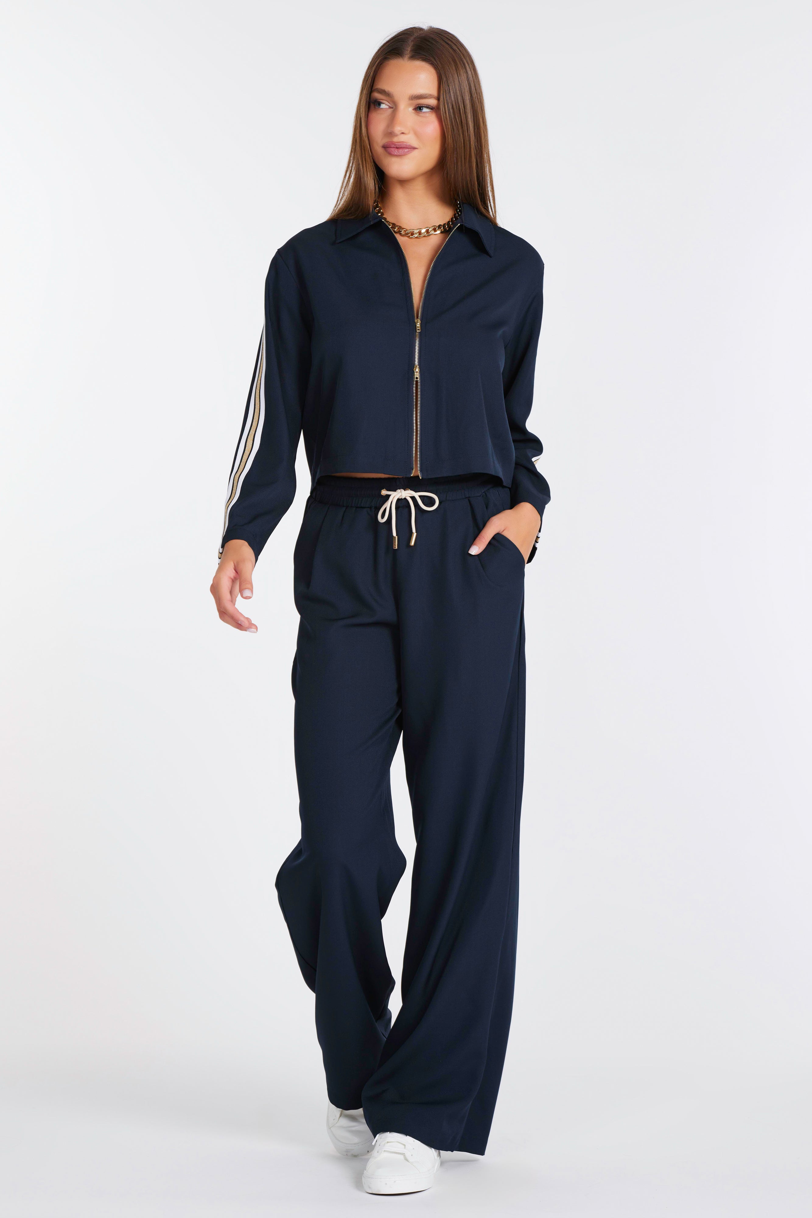Designed to blur the line between relaxed and refined, these navy drawstring pants offer a soft, draped silhouette that moves beautifully. Wear them with a tailored top or sleek knit to elevate your track-pant game while maintaining all-day comfort and versatility.