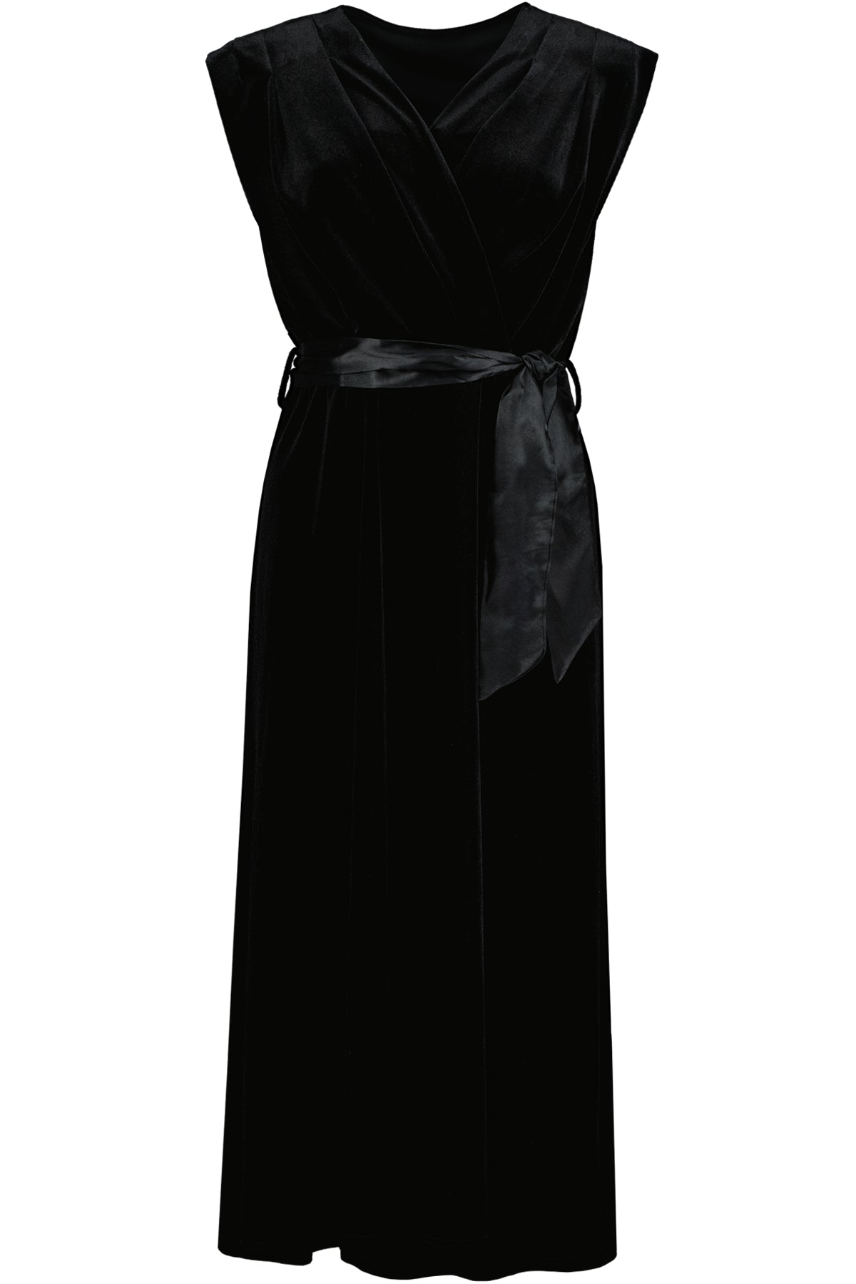 The Aeries Wrap Dress, now in luxe velvet. This faux wrap midi dress features pleated shoulders and shirred waist for a flattering fit. Finished with a satin tie belt, front slit, and an A-line skirt. Pair it with heels for a night out.